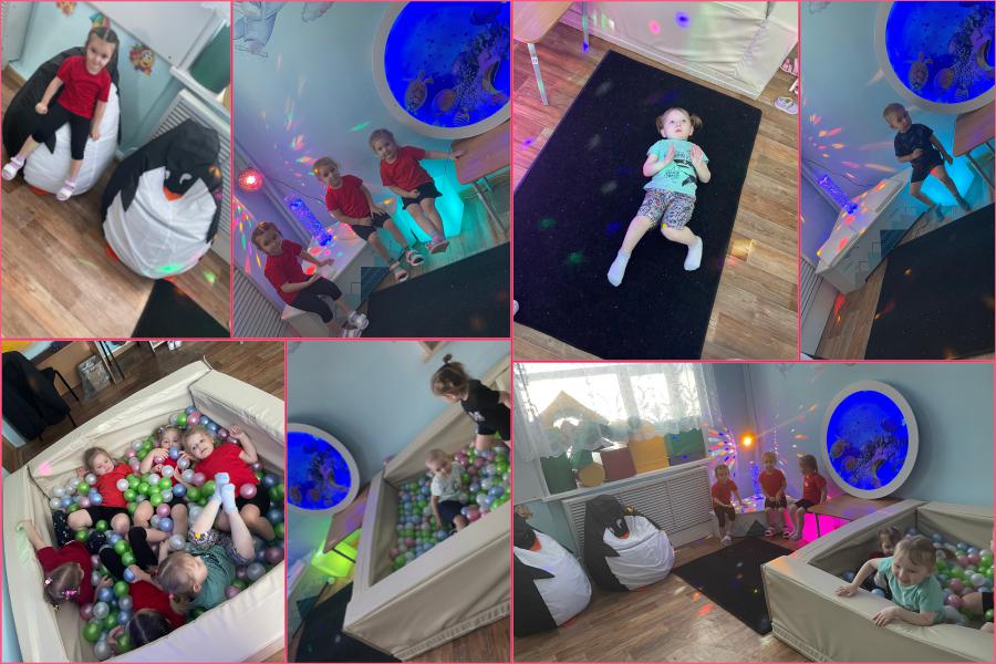 Сухой бассейн, сенсорный уголок "Горы", ковер "Звездное небо", настенное панно "Иллюминатор", кресло-мешки и многое другое дадут детям возможность расслабиться, да и просто поиграть в интересной обстановке.